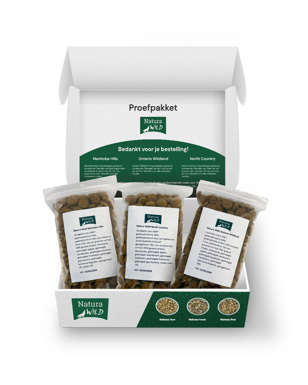 Het proefpakket wordt verzonden zonder verzendkosten en na aankoop ontvang je een kortingscode van 10% bij aankoop van een zak Natura Wild.